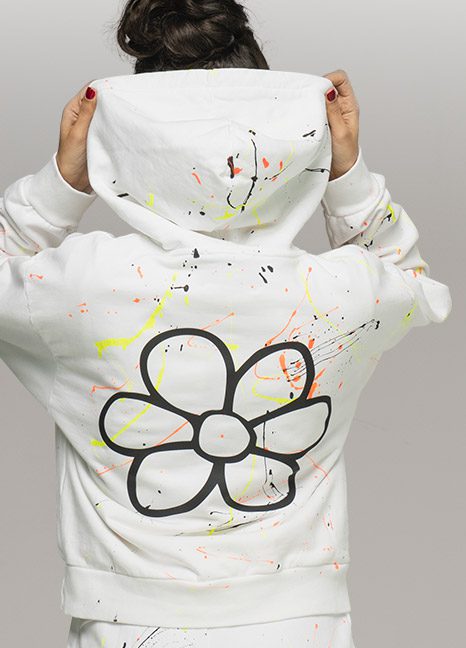 FELPA DONNA SCHIZZI CON CAPPUCCIO, STAMPA GURU TRANSFER BIANCA E LOGO MARGHERITA SULLA SCHIENA. 100% COTONE