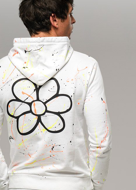 FELPA UOMO SCHIZZI CON CAPPUCCIO, TASCA MARSUPIO STAMPA GURU TRANSFER BIANCA E LOGO MARGHERITA SULLA SCHIENA. 100% COTONE