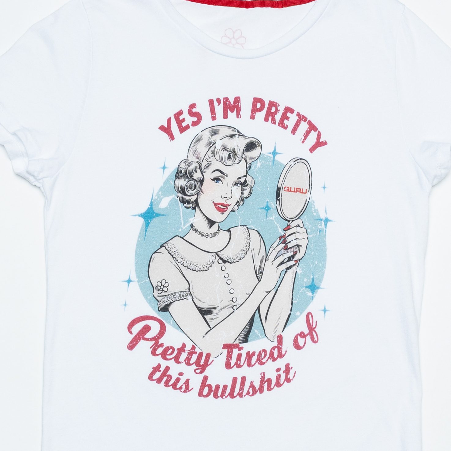 In this total white version, sarcasm is mirrored in the face of a girl in front of the mirror. An explosion of sincerity, lucidity and style. Perfect for those who no longer have patience–but still maintain elegance. GURU jersey and details complete the garment with quality and identity.