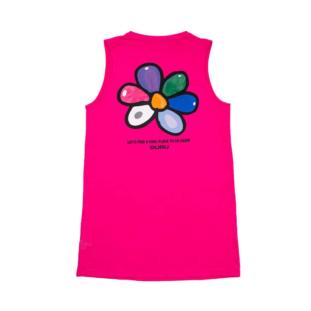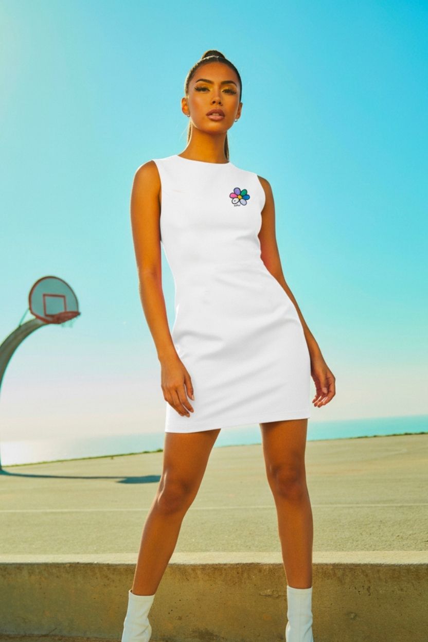Vestito corto in tessuto leggero di puro cotone senza maniche e scollo rotondo, con il logo stampato colorato sul lato cuore e sul retro.