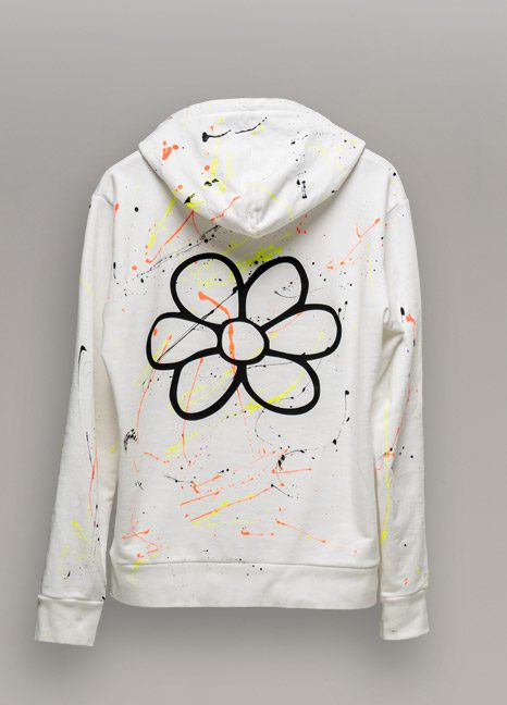 FELPA UOMO SCHIZZI CON CAPPUCCIO, TASCA MARSUPIO STAMPA GURU TRANSFER BIANCA E LOGO MARGHERITA SULLA SCHIENA.