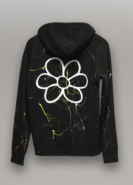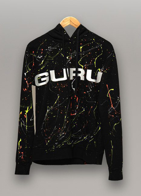 FELPA UOMO SCHIZZI CON CAPPUCCIO, TASCA MARSUPIO STAMPA GURU TRANSFER BIANCA E LOGO MARGHERITA SULLA SCHIENA.