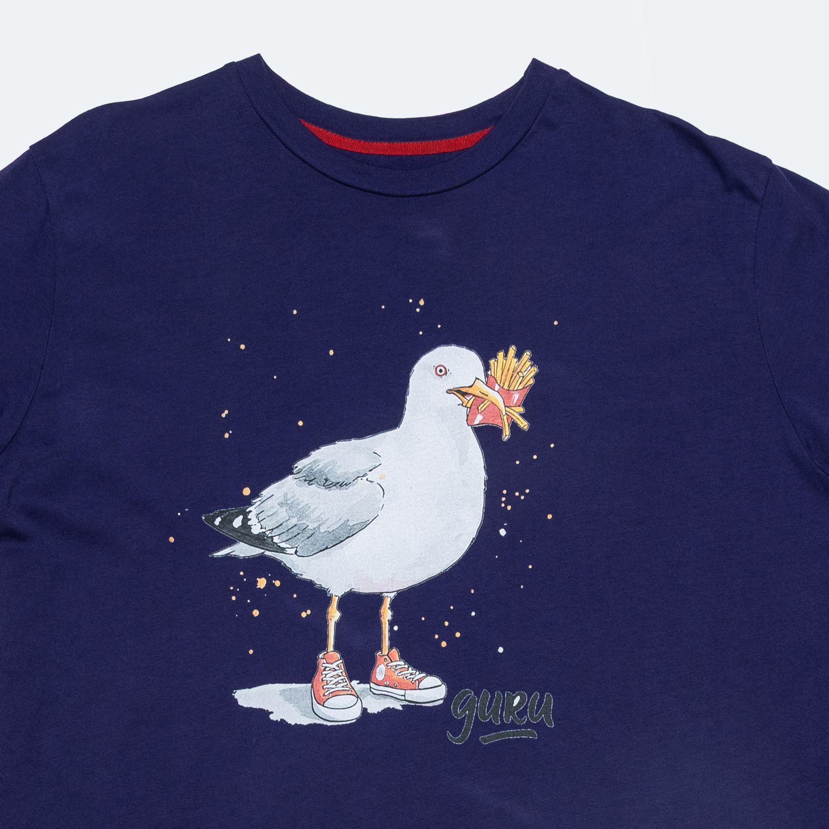 Un blu profondo con sfumature violacee definisce questa variante Future Dusk, perfetta per chi ama colori intensi e misteriosi. Il protagonista della stampa è un gabbiano: un’icona di ribellione in chiave pop. Realizzata in jersey con tintura diretta, presenta il ricamo GURU da 6 cm e la serigrafia “Daisy”, su una base che unisce mare e ironia urbana.