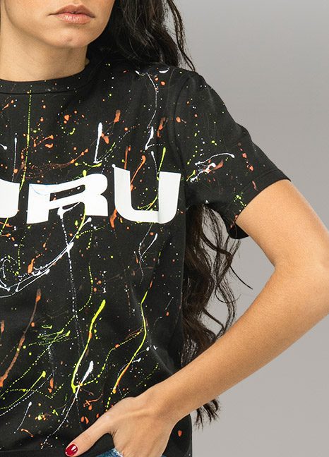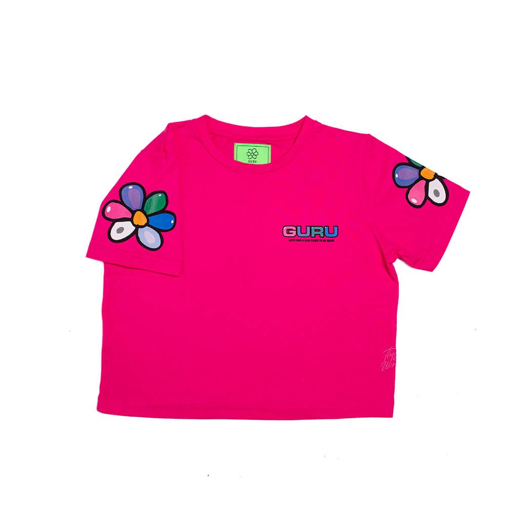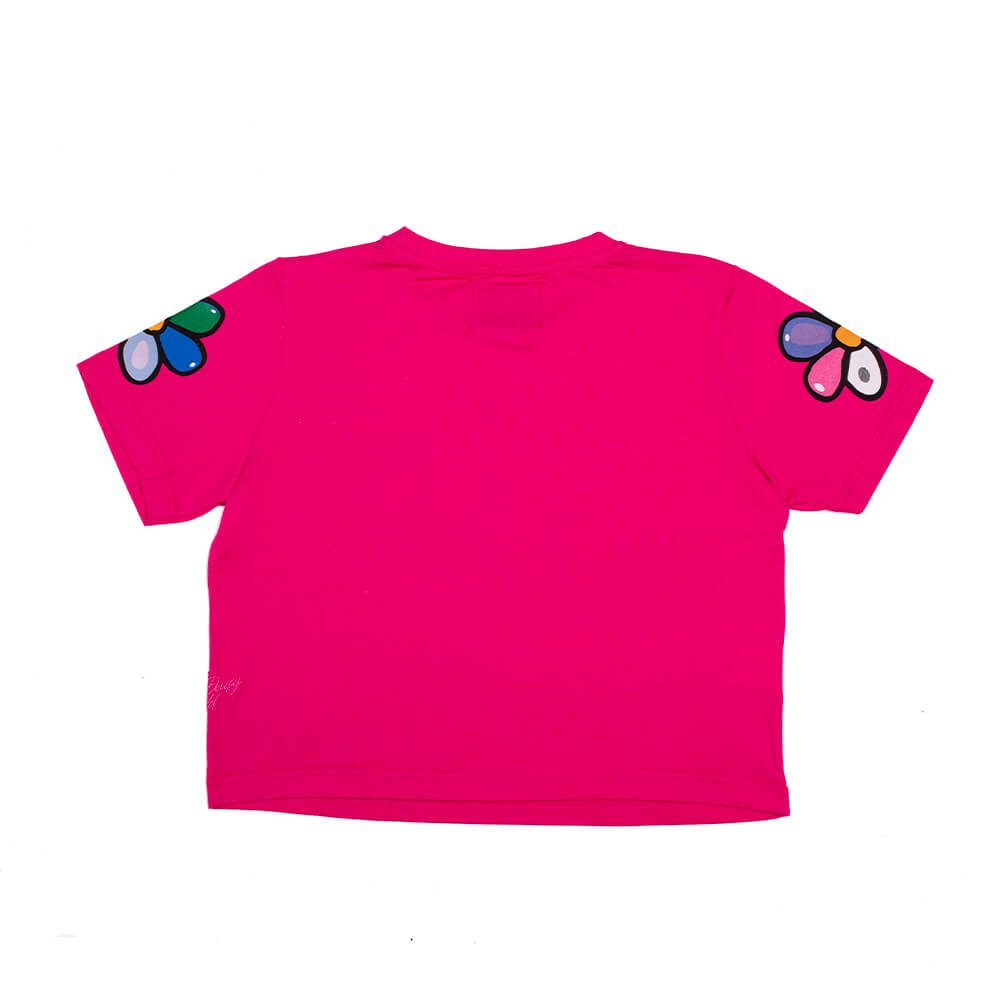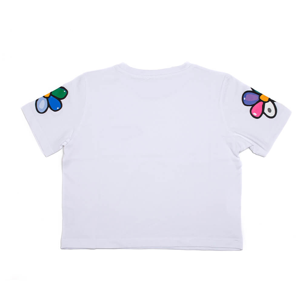 T-shirt cropped in morbido tessuto di puro cotone, con logo colorato stampato su lato cuore e logo fiore colorato sulle maniche.