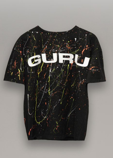 T-SHIRT UOMO SCHIZZI STAMPA GURU TRANSFER BIANCA E LOGO MARGHERITA SULLA SCHIENA.